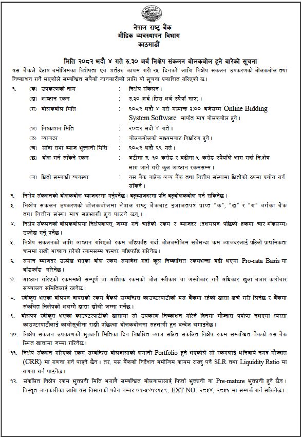 राष्ट्र बैंकका अनुसार आज अपराह्न तीन बजेसम्ममा अनलाइन बिडिङ सिस्टम सफ्टवेयर मार्फत उक्त परिमाणमा रकम तानिएको हो । परिपक्व हुने अवधि २५ दिन तोकिएको यो उपकरणको सावाँ व्याज भुक्तानी मिति भदौ २९ गते तोकिएको छ । राष्ट्र बैंकका अनुसार वाणिज्य बैंक, विकास बैंक र फाइनान्स कम्पनीहरूको लागि यो उपकरण बिक्री गरिएको हो ।