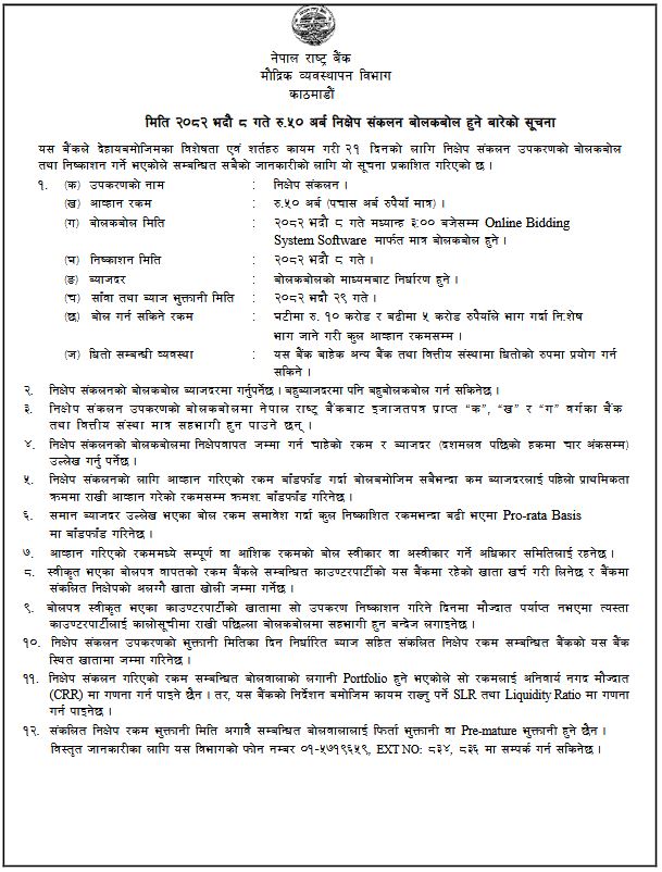 राष्ट्र बैंकका अनुसार आज अपराह्न तीन बजेसम्ममा अनलाइन बिडिङ सिस्टम सफ्टवेयर मार्फत उक्त परिमाणमा रकम तानिएको हो । परिपक्व हुने अवधि २१ दिन तोकिएको यो उपकरणको सावाँ व्याज भुक्तानी मिति भदौ २९ गते तोकिएको छ । राष्ट्र बैंकका अनुसार वाणिज्य बैंक, विकास बैंक र फाइनान्स कम्पनीहरूको लागि यो उपकरण बिक्री गरिएको हो ।