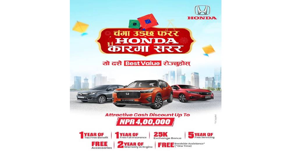 यसबाहेक, ग्राहकहरूले हरेक गाडीको खरिदमा निःशुल्क एसेसरिज, २ वर्षको इन्जिन वारेन्टी, र एक पटकको लागि निःशुल्क रोडसाइड असिस्टेन्स जस्ता थप सुविधा पनि प्राप्त गर्नेछन् । यी सबै अफरहरूले ग्राहकहरूलाई होन्डा गाडीको स्वामित्व ग्रहण गर्दा पूर्ण मानसिक शान्ति र उत्कृष्ट अनुभव प्रदान गर्ने कम्पनीले विश्वास लिएको छ। यो योजना होन्डाका लोकप्रिय मोडेलहरू जस्तै होन्डा सिटी, सिटी ईःएचईभी, एलिवेट, अमेज, र सिटी फिफ्थ जेनेरेसन लगायतका गाडीहरूमा उपलब्ध हुनेछ ।