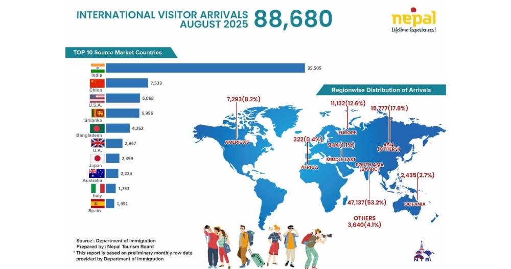 काठमाडौं । सन् २०२५ को अगष्टमा ८८ हजार ६८० पर्यटक नेपाल भित्रिएका छन् । नेपाल पर्यटन बोर्डले आज सार्वजनिक गरेको तथ्याङ्कअनुसार गत वर्षको तुलनामा यस वर्षको अगस्तमा २२ प्रतिशत विन्दुले पर्यटक आगमनमा वृद्धि भएको देखिएको छ ।