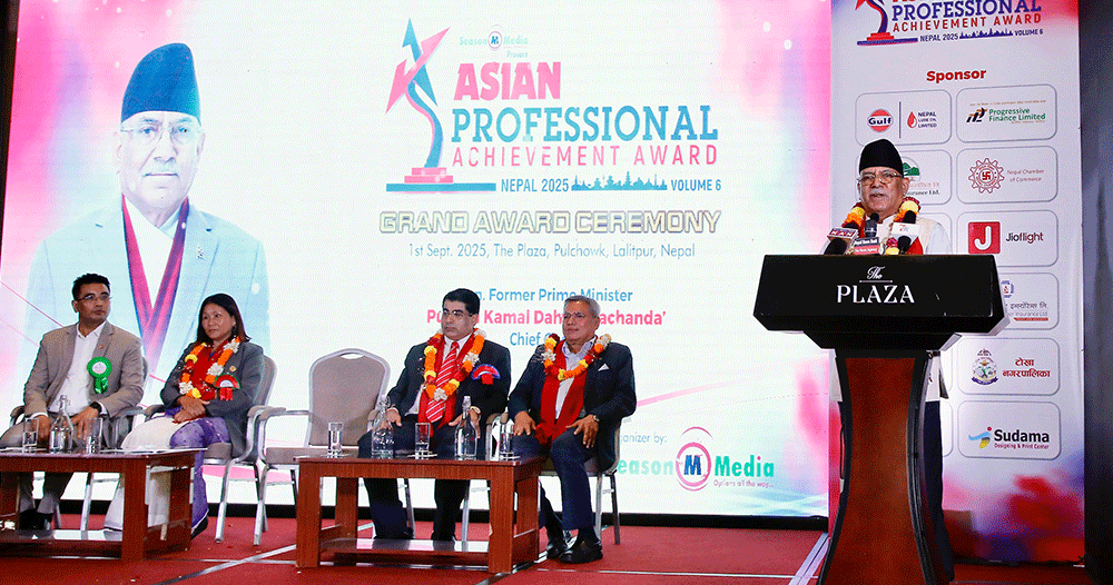 सिजन मिडियाको १७ औँ वार्षिकोत्सवको अवसरमा एसियाली मुलुकका विभिन्न पेसा तथा व्यवसायमा उत्कृष्ट काम गरिरहेका राष्ट्रिय तथा अन्तरराष्ट्रिय व्यक्तित्वहरुको सम्मानमा आज आयोजित ‘एसियाली व्यावसायिक उपलब्धि पुरस्कार २०२५’ लाई सम्बोधन गर्दै पूर्वप्रधानमन्त्री समेत रहेका दाहालले यस्ता कार्यले सकारात्मक र नयाँनयाँ काम गर्नेहरुलाई ऊर्जा प्राप्त हुने विश्वास व्यक्त गरे ।