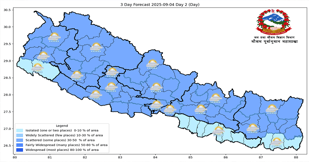 वाग्मती, गण्डकी र लुम्बिनी प्रदेशलगायत पहाडी भूभाग र तराईका केही स्थानमा मध्यम वर्षाको सम्भावना छ । मधेस र लुम्बिनी प्रदेशलगायत केही स्थानमा हुरी चल्ने सम्भावना छ ।