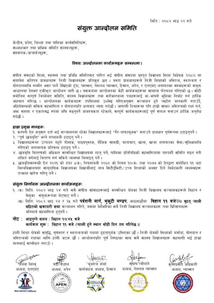 विज्ञप्तिमा शिक्षामा निजी क्षेत्रको योगदानलाई मान्यता नदिने खालका प्रावधानहरू अस्वीकार्य भएको उल्लेख गर्दै आन्दोलनमा सक्रिय सहभागिताका लागि सबै सदस्य विद्यालय, सञ्चालक तथा सरोकारवालालाई आह्वान गरिएको छ ।