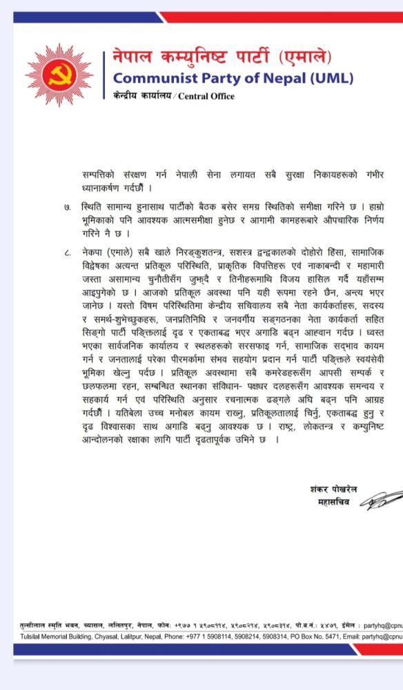 संसद्, राष्ट्रपति भवन, सिंहदरबार, सर्वोच्च अदालत, विमानस्थल, प्रहरी कार्यालयलगायत संवैधानिक निकायमा गरिएको तोडफोड तथा अभिलेख नष्ट हुनु राष्ट्रका लागि ठूलो क्षति भएको एमालेले जनाएको छ । त्यस्तै, १३ हजारभन्दा बढी कैदीबन्दी जेल तोडेर भाग्नु शान्ति(सुरक्षामा गम्भीर चुनौती बनेको एमालेको भनाइ छ ।