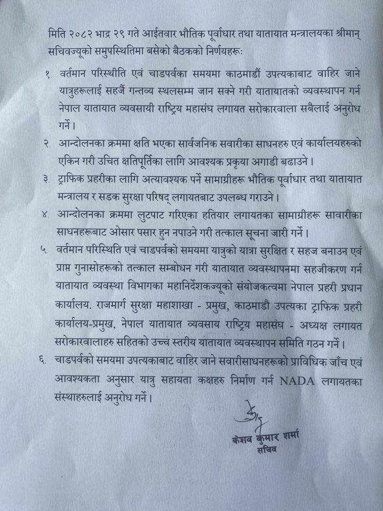 बैठकले चाडपर्वको समयमा काठमाडौं उपत्यकाबाट बाहिरिने यात्रुहरूलाई सहज र सुरक्षित यात्राको व्यवस्था मिलाउन नेपाल यातायात व्यवसायी राष्ट्रिय महासङ्घ लगायतका सरोकारवालालाई अनुरोध गर्ने निर्णय गरेको छ ।