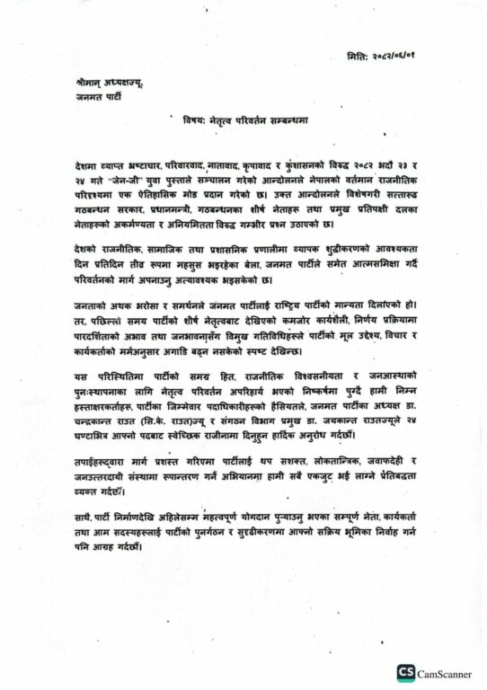 अध्यक्ष डा. राउतलाई पत्र लेखेर २४ घण्टाभित्र राजीनामा दिन उनीहरूले माग गरेका छन् । पछिल्लो समय पार्टीको शीर्ष नेतृत्वबाट देखिएको कमजोर कार्यशैली, निर्णय प्रक्रियामा पारदर्शिताको अभाव तथा जनभावनासँग विमुख गतिविधिले पार्टीको मूल उद्देश्य, विचार र कार्यकर्ताको मर्मअनुसार अगाडि बढ्न नसकेको भन्दै उनीहरूले राजीनामा माग गरेको पत्रमा उल्लेख छ ।