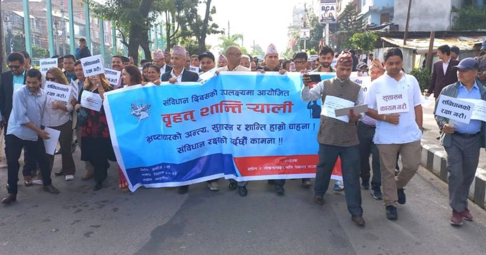 Kathmandu . A greater peace rally has been organized on the occasion of the Constitution Day this morning. The peace rally that began from Maitighar had reached Maitighar again via Bhadrakali, Shahid Gate where it converged into a corner meet.