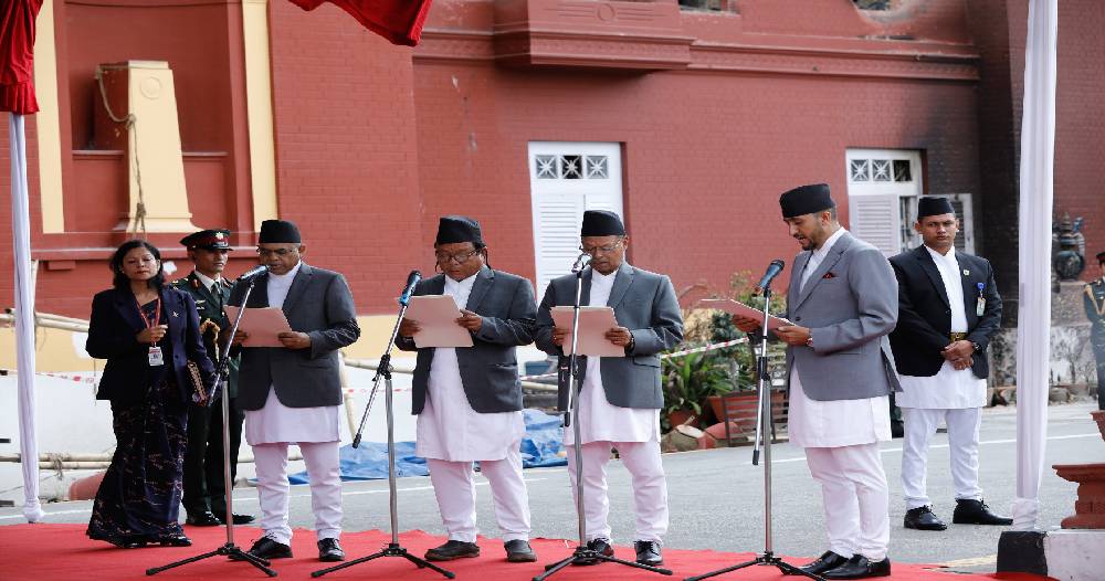 काठमाडौं । राष्ट्रपति रामचन्द्र पौडेलसमक्ष नेपाल सरकारका नवनियुक्त चार मन्त्रीहरूले आज पद तथा गोपनीयताको शपथ लिएका छन् ।
