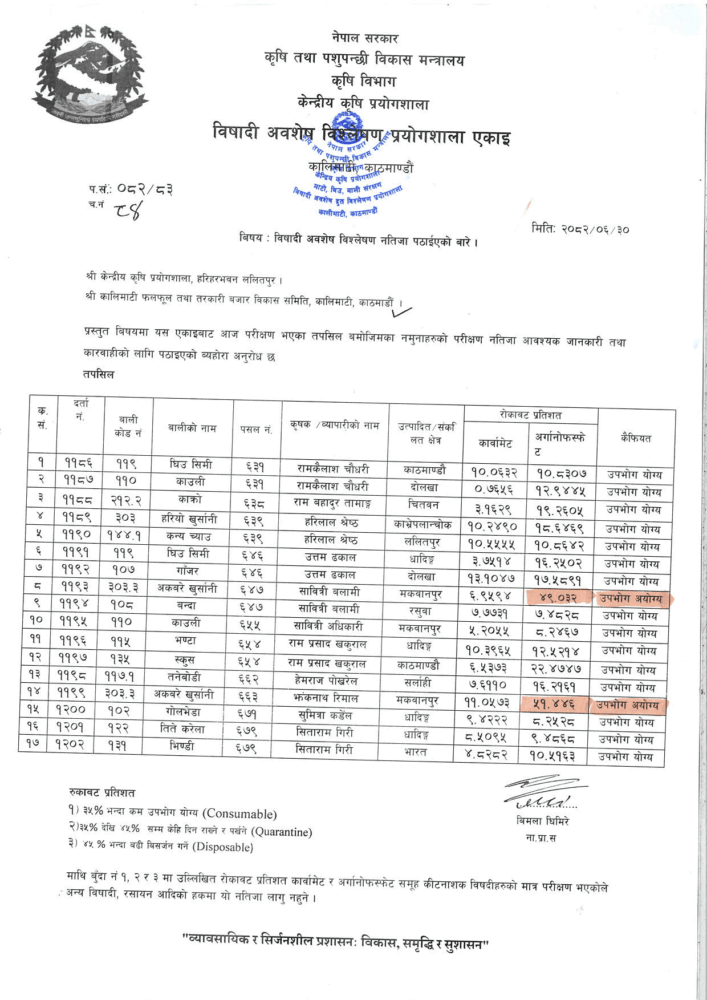 मकवानपुरबाट ल्याइएको पसल नम्बर ६४७ मा बिक्रीका लागि राखिएको अकबरेमा ४९.०३२ प्रतिशत र पसल नम्बर ६६३ मा राखिएको अकबरेमा ५१.४४६ प्रतिशत अर्गानोफस्फेट नामक विषादी फेला परेको जनाएको छ ।