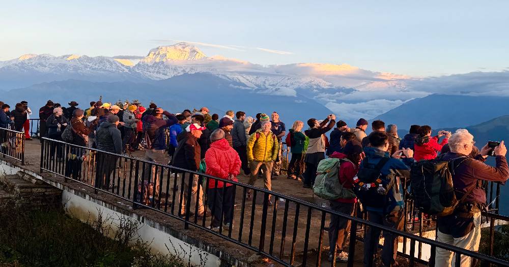 चराहरूको चिरबिरसँगै विस्तारै हिमाल खुल्न थाल्छ । घामको पहिलो झुल्का हिउँचुचुरोमा पर्दाको दृश्यले मोहित तुल्याउँछ । छिनभरमै घामका कलिला किरण पुनहिलमा छाइसक्छन् । हिमालको काखबाट सूर्य उदाएको दृश्यले कसलाई पो नलोभ्याउला र ! सूर्योदयको मनप्रिय दृश्यलाई आँखादेखि क्यामेरासम्म कैद गर्नेहरूको तछाडमछाड देखिन्छ । विदेशीहरू आफ्नै देशको झण्डा ओडेर तस्बिर खिचिरहेका भेटिन्छन् भने नेपालीहरू चन्द्र–सूर्य अङ्कित झण्डासहित ।