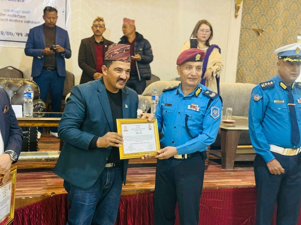 आज एक कार्यक्रमबीच प्रहरी अतिरिक्त महानिरीक्षक दानबहादुर कार्की र गैरआवासीय नेपाली सङ्घ (एनआरएनए) का अध्यक्ष महेशकुमार श्रेष्ठले संयुक्त रूपमा उनीलाई प्रमाणपत्रसहित सम्मान गरेका हुन् । जेन्जी प्रदर्शनका क्रममा क्षतिग्रस्त काठमाडौं उपत्यका ‘ट्राफिक कन्ट्रोल रूम’ पुनर्निर्माणमा सञ्चारमाध्यमका तर्फबाट उल्लेखनीय सहयोग पु-याएबापत उनीलाई सम्मान गरिएको हो ।