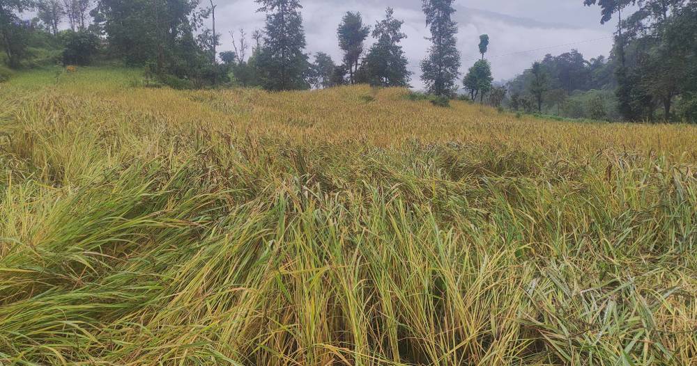 पाकेर थन्क्याउन लागिएको धानबालीमा वर्षाले क्षति गरेपछि कृषक चिन्तित