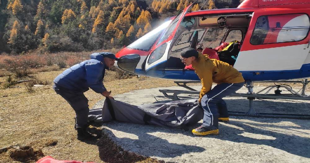 आरोहीको शव हेलिकोप्टरमार्फत सामागाउँ ल्याइएको छ । पाङबारीे हिमालबाट फर्कने क्रममा तीन इटालियन नागरिक र एक नेपाली सहयोगी गत बुधबारदेखि पहिलो शिविर र आधार शिविरमा अलपत्र परेका थिए । फरिनातो र गापुटो हिमाल आरोहण गर्न नसकेपछि फर्कने क्रममा हिमपातका कारण अलपत्र परेका बताइएको छ ।