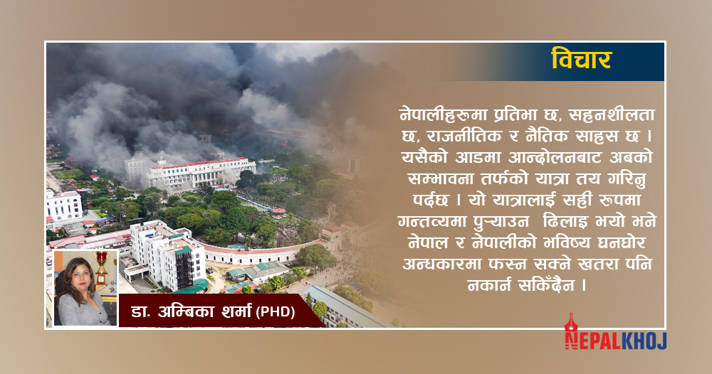 नेपालीहरूमा प्रतिभा छ, सहनशीलता छ, राजनीतिक र नैतिक साहस छ । यसैको आडमा आन्दोलनबाट अबको सम्भावना तर्फको यात्रा तय गरिनु पर्दछ । यो यात्रालाई सही रूपमा गन्तव्यमा पुर्याउन ढिलाइ भयो भने नेपाल र नेपालीको भविष्य घनघोर अन्धकारमा फस्न सक्ने खतरा पनि नकार्न सकिँदैन ।