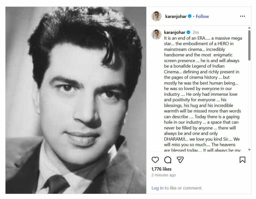 बलिउड फिल्म निर्माता करण जोहरले अभिनेता धर्मेन्द्रको निधन भएको पुष्टि गर्दै सामाजिक सञ्जालमार्फत श्रद्धाञ्जलि व्यक्ति गरेका छन् ।