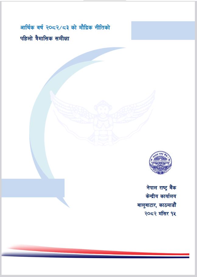 काठमाडौं । नेपाल राष्ट्र बैंकले चालु आर्थिक वर्षको मौद्रिक नीतिको पहिलो त्रैमासिक समीक्षा सार्वजनिक गरेको छ । सोमबार राष्ट्र बैंकले नीतिगत दरहरू फेरबदल गर्दै चालु आर्थिक वर्ष २०८२/०८३ को मौद्रिक नीतिको पहिलो त्रैमासिक समीक्षा सार्वजनिक गरेको हो ।