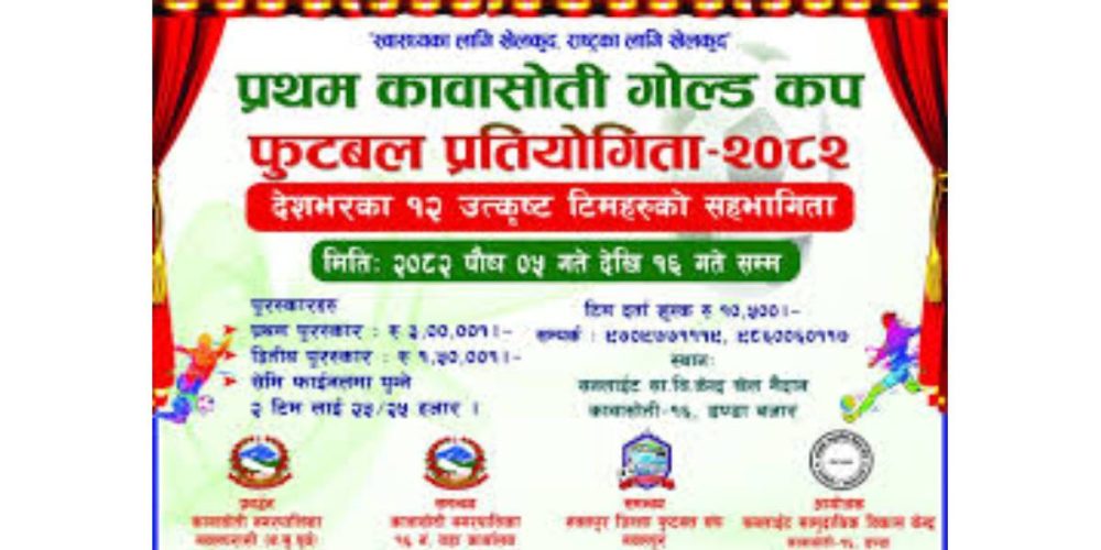 त्रिवेणी (नवलपरासी) । ‘स्वास्थ्यका लागि खेलकुद, राष्ट्रका लागि खेलकुद’ भन्ने मूल नारासहित प्रथम कावासोती गोल्डकप फुटबल प्रतियोगिता–२०८२, आजदेखि सुरु हुँदैछ ।