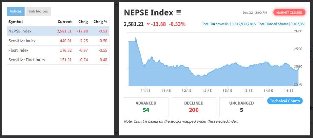 नेप्से झण्डै १४ अंकले घट्दा तीन अर्ब ५१ करोडको सेयर काराेबार