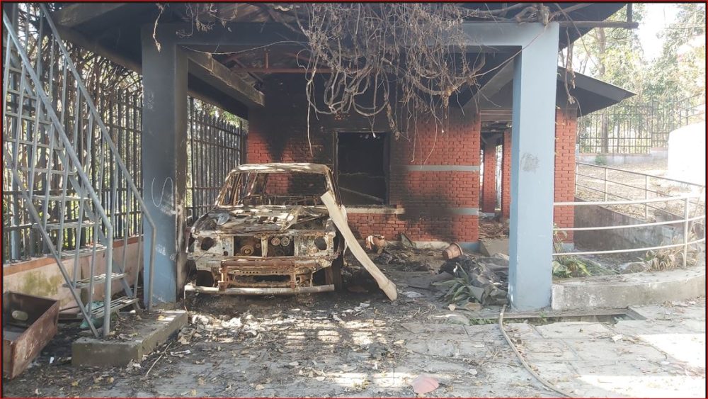 आश्रमको ताला लगाउने ठाउँमा बेरिएको तार, आश्रम परिसरमा आगजनी गरिएका दुईवटा सवारी अलपत्र थिए । आश्रमको सिसा फुटाइएका झ्याल, ट्रष्ट फ्याँकिएको कार्यक्रमस्थल मात्रै बाँकी थिए ।