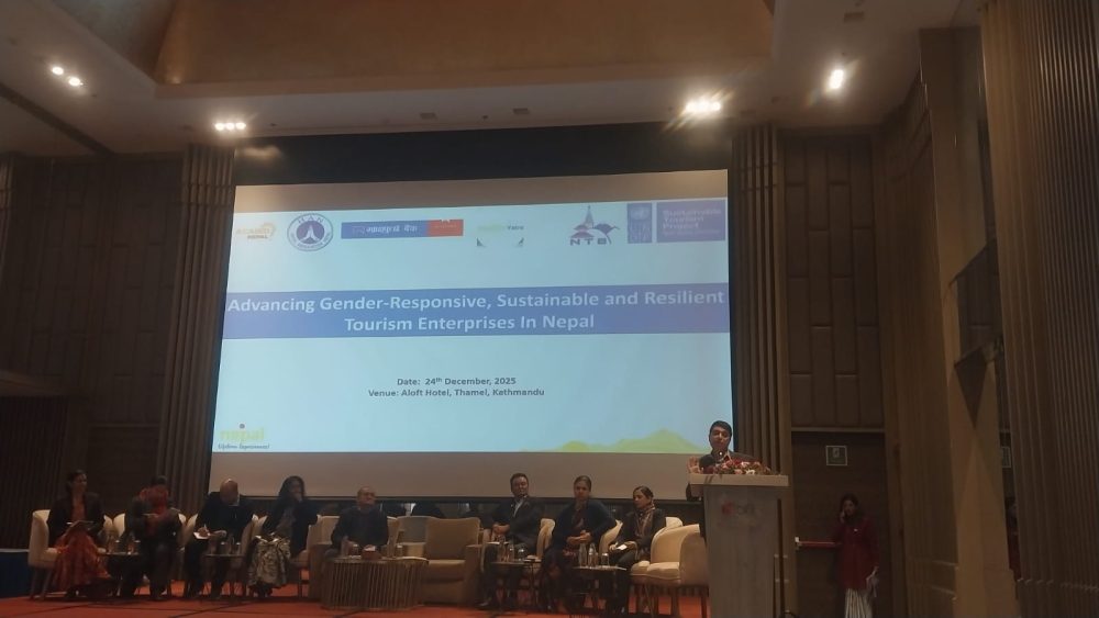 काठमाडौं । नेपालमा लैङ्गिक उत्तरदायी र दिगो पर्यटन प्रवद्र्धनका लागि ‘लैङ्गिक उत्तरदायी, दिगो तथा उत्थानशील पर्यटन उद्यम प्रवद्र्धन’ विषयक उच्चस्तरीय नीतिगत संवाद गरिएको छ । काठमाडौंमा बुधबार नीति निर्माता, विकास साझेदार, निजी क्षेत्रका प्रतिनिधि, महिला पर्यटन उद्यमी तथा विज्ञहरूको सहभागितामा नीति संवाद आयोजना गरिएको हो । कार्यक्रममा पर्यटन क्षेत्रमा समावेशी आर्थिक वृद्धि र महिला उद्यमशीलता प्रवद्र्धनका उपायहरूमाथि छलफल गरिएको छ ।