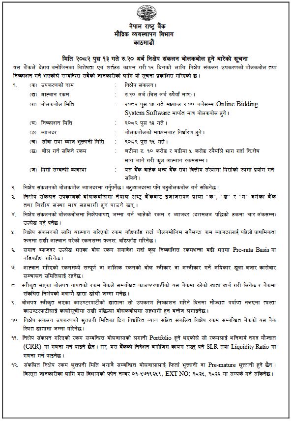 राष्ट्र बैंकका अनुसार आज अपरान्ह दुई बजेसम्ममा अनलाईन बिडिङ सिस्टम सफ्टवेयर मार्फत उक्त परिमाणमा रकम तानिने छ । परिपक्व हुने अवधि १२ दिन तोकिएको यो उपकरणको सावाँ व्याज भुक्तानी मिती पुस २५ गते तोकिएको छ ।