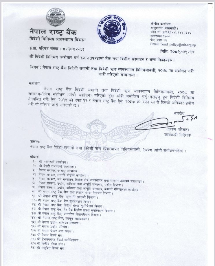 काठमाडौं । नेपाल राष्ट्र बैंकले विदेशी लगानी तथा विदेशी ऋण व्यवस्थापन विनियमावली, २०७८ को पाँचौं संसोधन सार्वजनिक गरेको छ । नेपाल राष्ट्र बैंक विदेशी लगानी तथा विदेशी ऋण व्यवस्थापन विनियमावली, २०७८ विदेशी लगानी बापतको विदेशी मुद्रा भित्र्याउने स्वीकृति तथा लेखाङ्कन गर्ने, विदेशी लगानी तथा सोबाट आर्जित रकम फिर्ता लैजाने, विदेशी ऋणको स्वीकृति, विदेशी ऋणबापत विदेशी मुद्रा भित्र्याउने तथा सोको लेखाङ्कन गर्ने र विदेशी ऋणको साँवा तथा ब्याज भुक्तानीका लागि विदेशी मुद्राको सटही प्रदान गर्ने, विदेशमा लगानीको नियमनद्ध लगायतका विषयहरूलाई व्यवस्थित तथा सहजीकरण गरी विदेशी लगानी आकर्षित गर्न एवम् आर्थिक क्रियाकलापहरू सहज रूपमा सञ्चालन हुने वातावरण सिर्जना गर्न वाञ्छनीय भएकोले विदेशी विनिमय (नियमित गर्ने) ऐन, २०१९ को दफा १२ र नेपाल राष्ट्र बैंक ऐन, २०५८ को दफा ११० को उपदफा (२) ले दिएको अधिकार प्रयोग गरी नेपाल राष्ट्र बैंकको सञ्चालक समितिले विनियमहरू बनाएको राष्ट्र बैंकले जानकारी दिएको छ ।