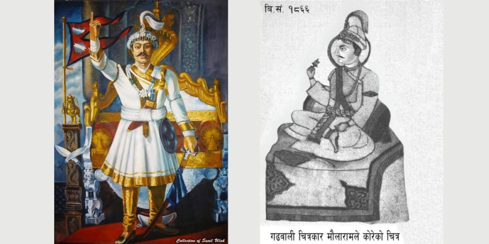 जुनबेला आगरामा ताजमहल बन्दै थियो, गोरखामा डम्बर शाह र कृष्ण शाहको शासनकाल चलिरहेको थियो । यिनै शाहजहाँको मृत्यु पछि राजा बनेका उनका छोरा औरंगजेबको समयमा दिल्ली दरवारबाट भागेर तीन चित्रकार गढवाल पुगेका थिए । यसरी मुगल साम्राज्यबाट भागेर गढवाल पुगेका हरदासको नाति नै मौलाराम हुन् । मौलारामलाई अहिले विश्वविख्यात भएको गढवाली चित्रकारिताको जन्मदाता मानिन्छ । यिनै मौलारामले कोरेको पृथ्वीनारायण शाहको चित्रमा पनि केही गन्ध गढवाली शैलीको आएको देखिन्छ । त्यतिबेलाका चित्रकारितामा दुइ शैली प्रख्यात थिए कांगडा शैली र गढवाली शैली । कांगडा शैलीमा अनुहारको आकारमा निधार देखि नाकसम्म सिधा धर्सो हुन्थ्यो भने चिउडोबाट घाँटीसम्म पनि सिधा धर्सो तानिन्थ्यो । जसले गर्दा अनुहार चारपाटे देखिन्थ्यो । तर गढवालीशैलीमा भने निधारबाट नाकसम्ममा बिचमा केही गहिराइ हुन्थ्यो । साथै चिउडोबाट गलामा पनि केही घुमाउरो हुन्थ्यो ।