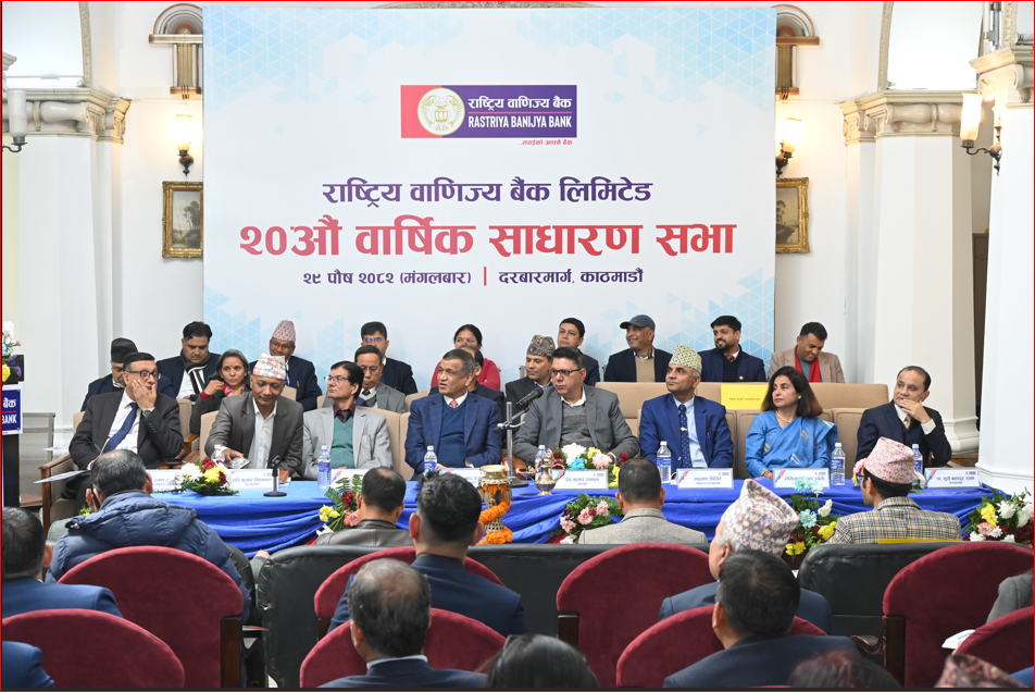 काठमाडौं । राष्ट्रिय वाणिज्य बैंक लिमिटेडको २० औं वार्षिक साधारण सभा सम्पन्न भएको छ । बैंकको मंगलबार सम्पन्न साधारण सभाले आर्थिक वर्ष २०८१ /८२ को वार्षिक प्रतिवेदन, आर्थिक वर्ष २०८२/८३ को लागि लेखापरीक्षक नियुक्ति लगायतका विभिन्न प्रस्तावहरु पारित गरेको छ ।