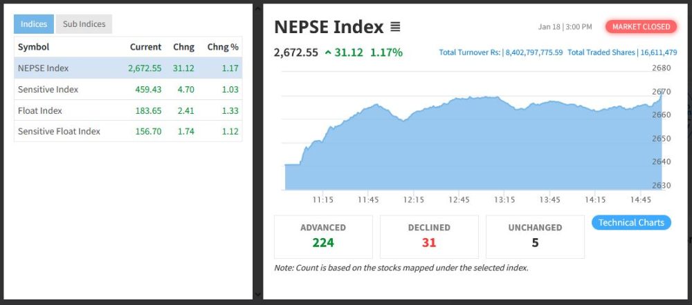 सेयर बजारमा उछाल, ३१ अंकले बढ्दा आठ अर्ब ४० करोडको सेयर किनबेच्र