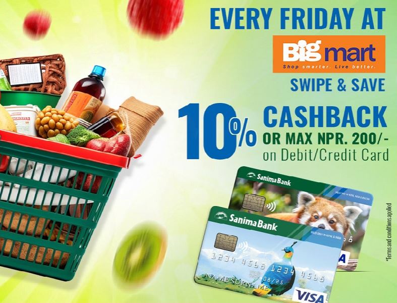 उक्त योजना अन्तर्गत, सानिमा बैंकका ग्राहकहरुले हरेक शुक्रबार सानिमा डेबिट तथा क्रेडिट कार्ड मार्फत बीग मार्टमामा सामान खरिद गरी भुक्तानी गर्दा १० प्रतिशत वा अधिकतम २०० रूपैयाँसम्मको क्यासब्याक पाउने व्यवस्था गरेको छ ।