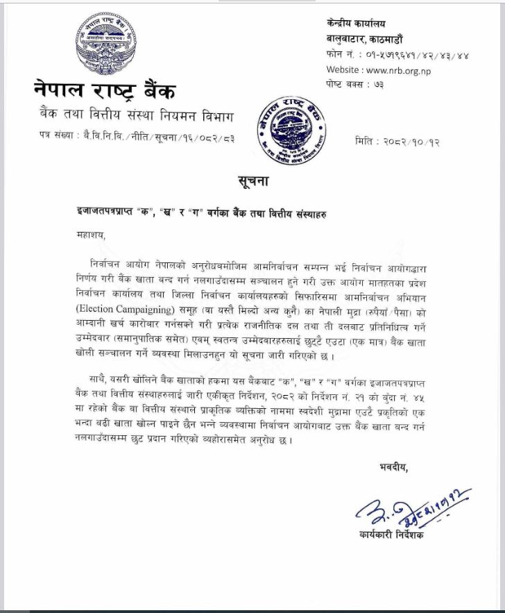 साथै, यसरी खोलिने बैंक खाताको हकमा यस बैंकबाट “क“, “ख“ र “ग“ वर्गका इजाजतपत्रप्राप्त बैंक तथा वित्तीय संस्थाहरुलाई जारी एकीकृत निर्देशन, २०८२ को निर्देशन नं. २१ को बुँदा नं. ४५ मा रहेको बैंक वा वित्तीय संस्थाले प्राकृतिक व्यक्तिको नाममा स्वदेशी मुद्रामा एउटै प्रकृतिको एक भन्दा बढी खाता खोल्न पाइने छैन भन्ने व्यवस्थामा निर्वाचन आयोगबाट उक्त बैंक खाता बन्द गर्न नलगाउँदासम्म छुट प्रदान गरिएको व्यहोरा समेत अनुरोध छ, पत्रमा भनिएको छ ।