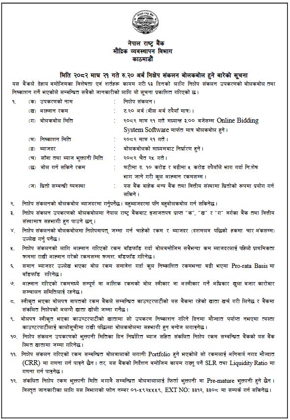 राष्ट्र बैंकका अनुसार आज अपरान्ह तीन बजेसम्ममा अनलाईन बिडिङ सिस्टम सफ्टवेयर मार्फत उक्त परिमाणमा रकम तानिने छ । परिपक्व हुने अवधि ६३ दिन तोकिएको यो उपकरणको सावाँ व्याज भुक्तानी मिती चैत्र २५ गते तोकिएको छ ।