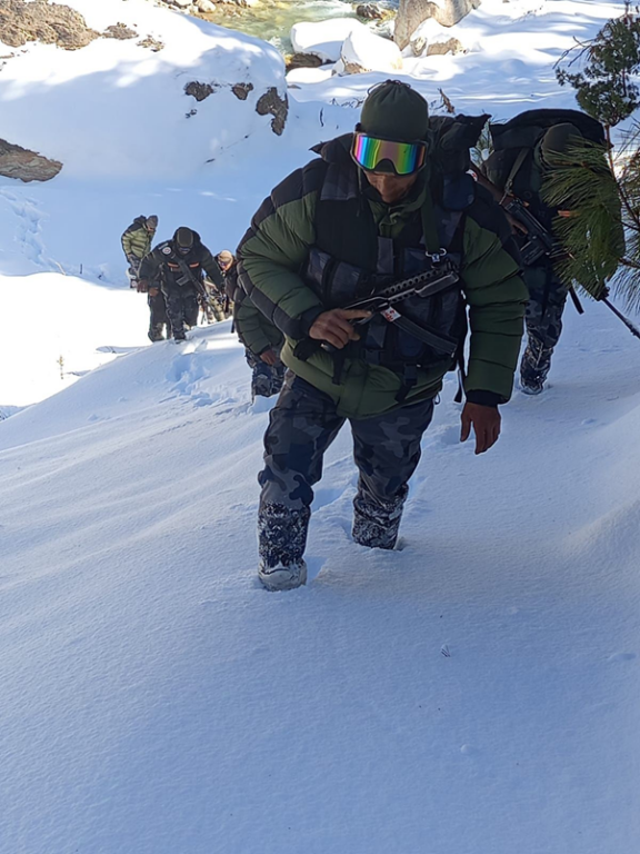 दार्चुला । कठोर जाडोकाबीच पनि हतियारसहित गस्तीमा निस्किएका उहाँहरू राष्ट्रको सीमालाई सुरक्षित राख्न निरन्तर सक्रिय छन् । भारी हिउँमा बुट गाड्दै अघि बढ्नु सजिलो पनि छैन । प्रत्येक पाइला जोखिमसँग जोडिएको छ । चिप्लो जमिन, हिमपहिरोको सम्भावना र शून्य नजिकैको तापक्रमबीच पनि उनीहरूको कदम रोकिँदैन् ।दार्चुलाको व्यास गाउँपालिका–१ छाङरूस्थित सशस्त्र प्रहरी बल नेपाल नम्बर ५० गुल्म पूरै हिउँले ढाकिएको छ ।
