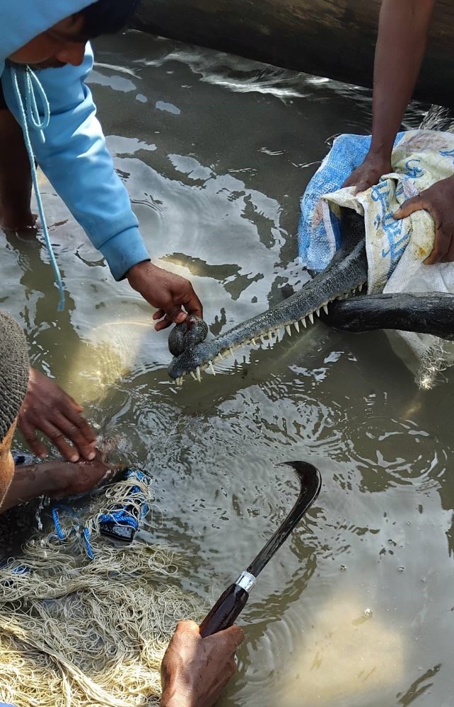 मुखमा तियारी (खोलामा माछा मार्न प्रयोग हुने) जाल अड्किएको अवस्थामा नवलपरासी (बर्दघाट–सुस्तापूर्व)को कावासोतीमा पर्ने अमलटारीघाटस्थित नारायणी नदीमा फेला परेको घडियालको स्थानीय बोटे समुदायको सक्रियतामा उद्धार गरिएको हो ।