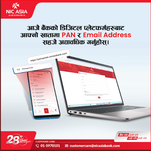 काठमाडौं । एनआईसी एशिया बैंकले आफ्ना ग्राहकहरूलाई आफ्नो खातामा स्थायी लेखा नम्बर (प्यान) र ईमेल ठेगाना अद्यावधिक गर्न आग्रह गरेको छ ।