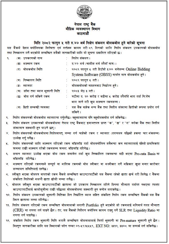 राष्ट्र बैंकका अनुसार आज अपरान्ह तीन बजेसम्ममा अनलाईन बिडिङ सिस्टम सफ्टवेयर मार्फत उक्त परिमाणमा रकम तानिने छ । परिपक्व हुने अवधि ८९ दिन तोकिएको यो उपकरणको सावाँ व्याज भुक्तानी मिती जेठ तीन गते तोकिएको छ ।