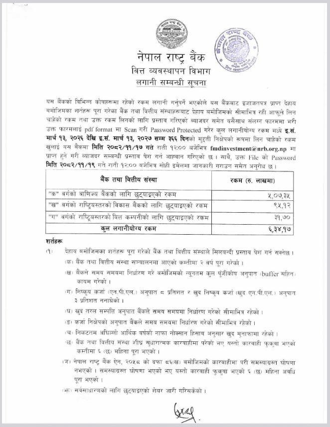 राष्ट्र बैंकका अनुसार रकम लगानीको अवधि मार्च १३, २०२६ देखि मार्च १३, २०२७ सम्म रहने छ । रकम लगानी गर्न चाहाने बैक तथा फाईनान्स कम्पनीहरुले यही फागुन १७ गतेसम्म लगानी गर्न चाहेको रकम र दिन चाहेको व्याज समेत तोकेर प्रस्ताव पेस गर्नुुपर्ने छ ।