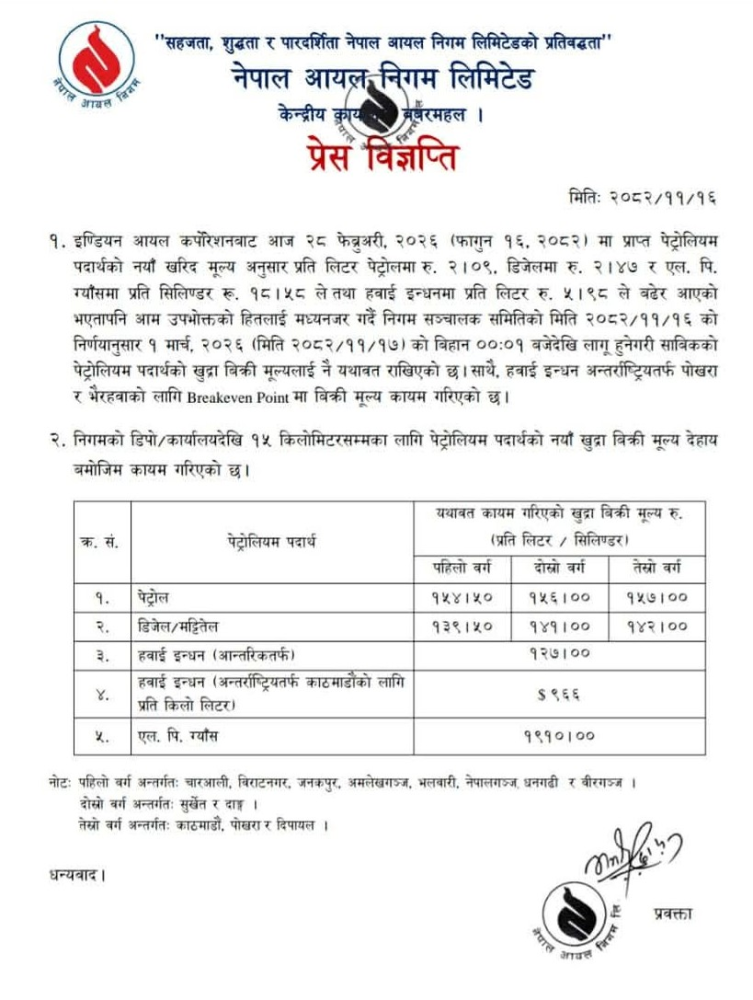 हाल पेट्रोलको पहिलो वर्गमा १५४ रुपैयाँ ५० पैसा दोस्रो वर्गमा १५६ रुपैयाँ र तेस्रो वर्गमा १५७ रुपैयाँ प्रतिलिटर तोकिएको छ ।