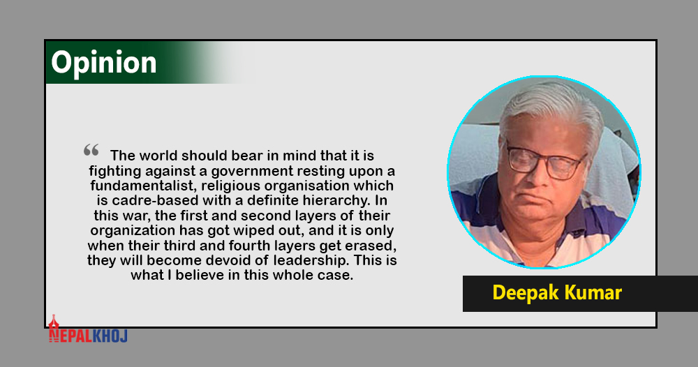 The world should bear in mind that it is fighting against a government resting upon a fundamentalist, religious organisation which is cadre-based with a definite hierarchy. In this war, the first and second layers of their organization has got wiped out, and it is only when their third and fourth layers get erased, they will become devoid of leadership. This is what I believe in this whole case.