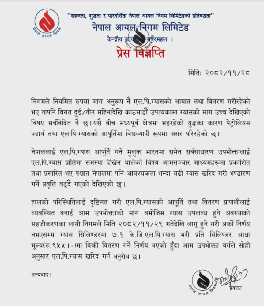 यही फागुन २९ गतेदेखि अर्को व्यवस्था नभएसम्मका लागि यस्तो निर्णय गरिएको निगमले जनाएको छ । साथै निगमले ग्यासको तौल घटाएर मूल्य पनि घटाएको छ । “ग्यास सिलिन्डरमा ७.१ केजी एलपी ग्यास भरी प्रतिसिलिन्डर आधार मूल्य (रु ९५५) मा विक्री वितरण गर्ने निर्णय भएको…,” निगमले भनेको छ ।