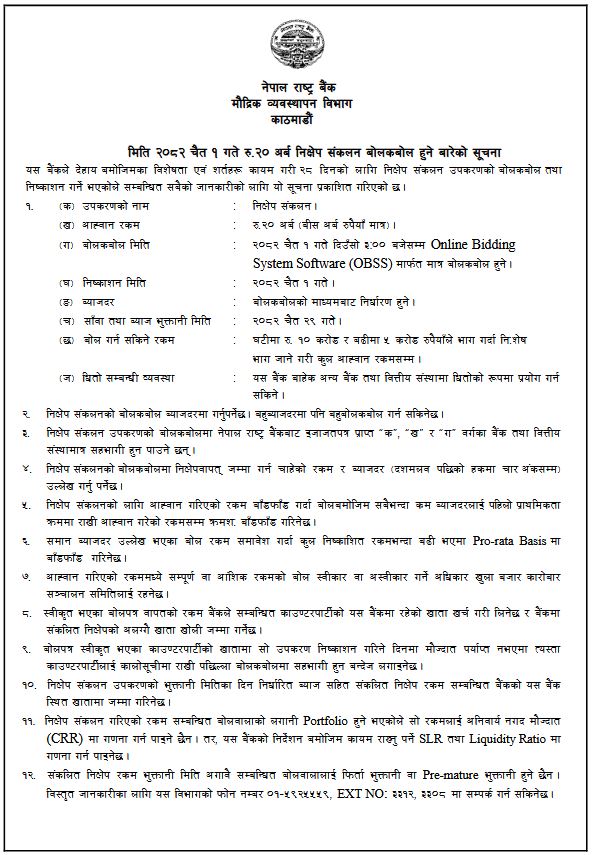 राष्ट्र बैंकका अनुसार आज अपरान्ह तीन बजेसम्ममा अनलाईन बिडिङ सिस्टम सफ्टवेयर मार्फत उक्त परिमाणमा रकम तानिने छ । परिपक्व हुुने अवधि २८ दिन तोकिएको यो उपकरणको सावाँ व्याज भुक्तानी मिती चैत्र २९ गते तोकिएको छ । राष्ट्र बैंकका अनुसार बाँणिज्य बैंक, बिकास बैंक र फाईनान्स कम्पनीहरुले खरिद गर्न सक्ने गरी यो निक्षेप उपकरण बिक्री हुन लागेको हो ।