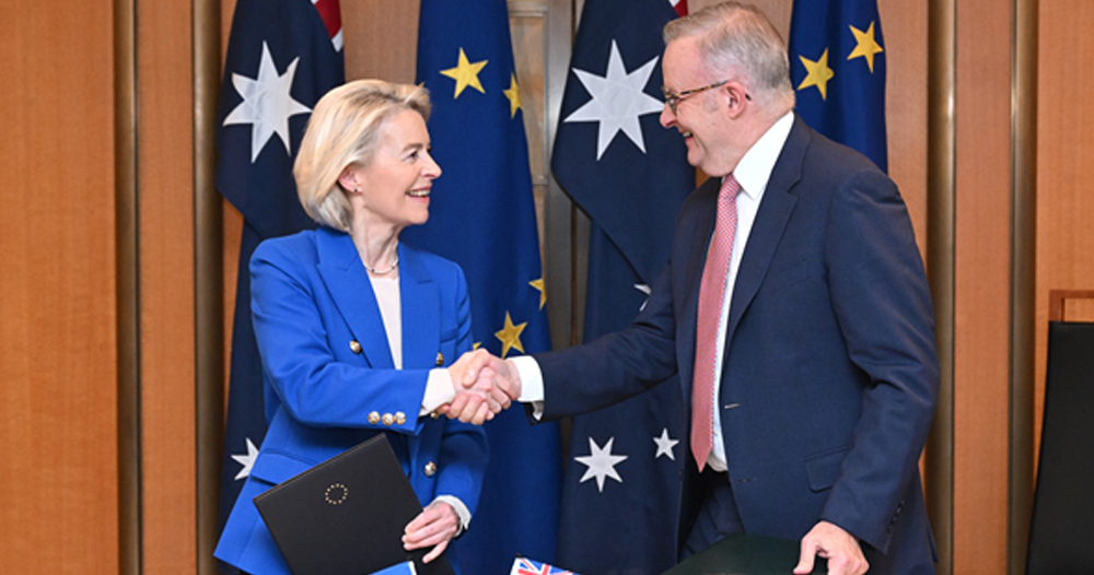 युरोपेली आयोगकी अध्यक्ष उर्सुला भोन डेर लेयन र अस्ट्रेलियाका प्रधानमन्त्री एन्थोनी अल्बानिजले सन् २०१८ देखि जारी लामो वार्तापछि अस्ट्रेलियाको संसद् भवनमा सम्झौतामा हस्ताक्षर गर्नुभएको हो । यसअघि अस्ट्रेलियाको रातो मासु बजार पहुँच र उत्पादनसम्बन्धी विवादका कारण सन् २०२३ मा वार्ता अवरुद्ध भएको थियो ।