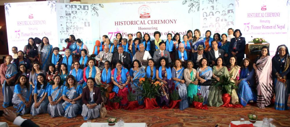 काठमाडौं । नेपाल महिला चेम्बरले नेपाल चेम्बर अफ कमर्सको ७५ औं वार्षिक उत्सव हीरक जयन्तीको अवसरमा देशका विभिन्न क्षेत्रहरूमा ऐतिहासिक योगदान पुर्याएका अग्रणी नेपाली महिलाहरूलाई विशेष समारोहबीच सम्मान गरेको छ ।