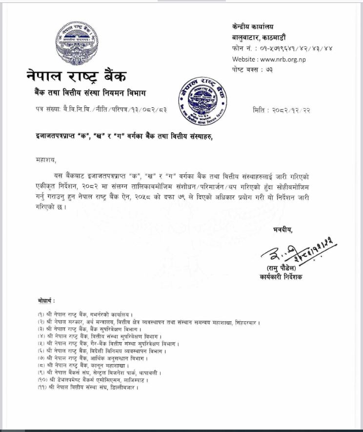 राष्ट्र बैंकले थप गर्याे एकीकृत निर्देशन, २०८२ मा संशोधन