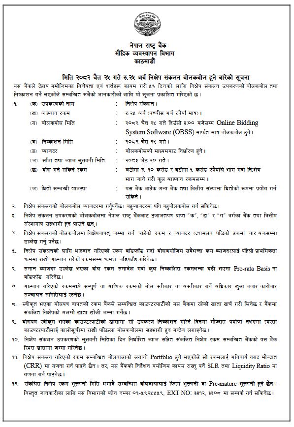 राष्ट्र बैंकका अनुसार आज अपरान्ह तीन बजेसम्ममा अनलाईन बिडिङ सिस्टम सफ्टवेयर मार्फत उक्त परिमाणमा रकम तानिने छ । परिपक्व हुने अवधि ५६ दिन तोकिएको यो उपकरणको सावाँ व्याज भुक्तानी मिती आगामी जेठ २० गते तोकिएको छ । राष्ट्र बैंकका अनुसार बाँणिज्य बैंक, बिकास बैंक र फाईनान्स कम्पनीहरुले खरिद गर्न सक्ने गरी यो निक्षेप उपकरण बिक्री हुन लागेको हो ।
