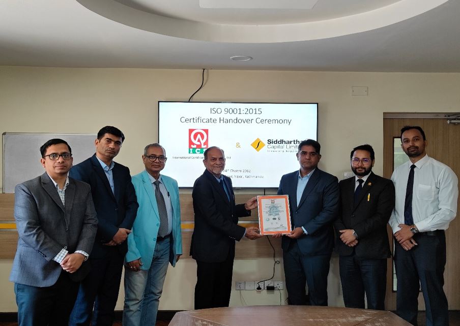 सिद्धार्थ क्यापिटलले पायो आईएसओ प्रमाणपत्र